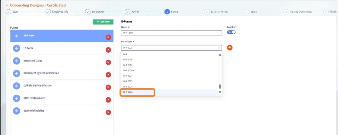 6. The left-side shows all forms associated with this Onboarding packet. To update a form, click from on the Forms list on the left and select the new Form Type from the drop-down list.