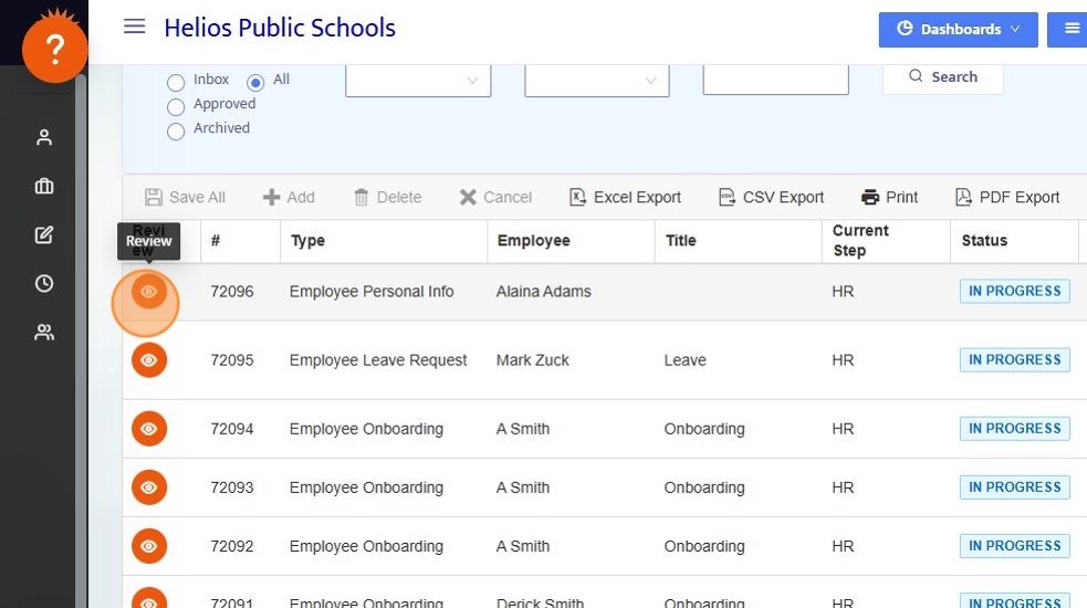 1. From the Workflows Dashboard, Workflows are visible based on User Access. District Admin users have access to All Workflows, while Site Admin will only see Workflows that are either assigned to them or that they've been granted access to.