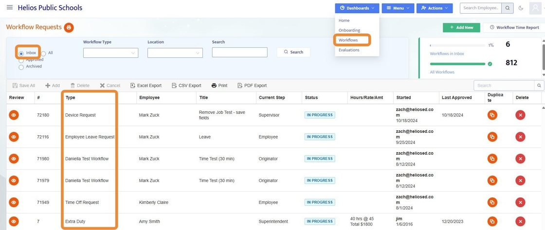 5. In the Workflows Dashboard Inbox, users see the Workflow Types that are pertinent to them - access to Workflow Types can be restricted in the User Access menu so that certain types of Workflows are not visible to certain users.