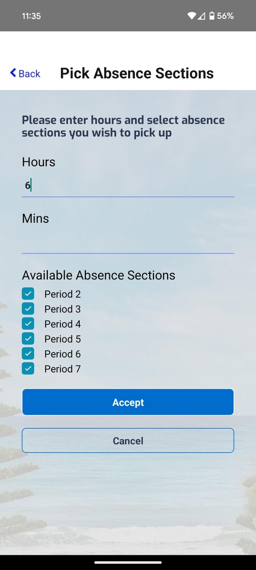 6. If the absence has absence sections, it will ask which sections you will be filling and how many hours (note, substitute hours can be equal to or less than the absence hours).
