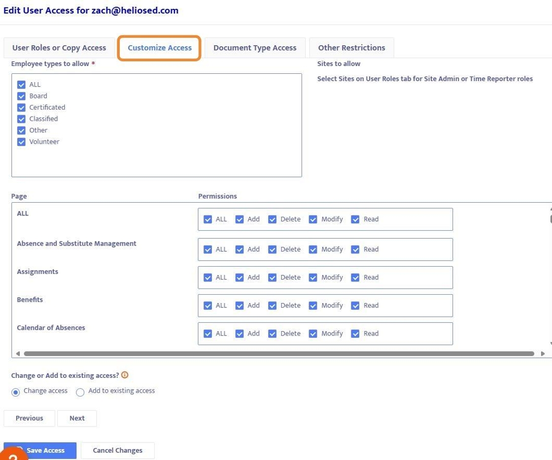 - Set the Permissions to certain pages within Helios. There are many pages and dashboards that can be customized, like Absences and Substitutes, Workflows, Employee Profile, Evaluations, Onboarding, etc.