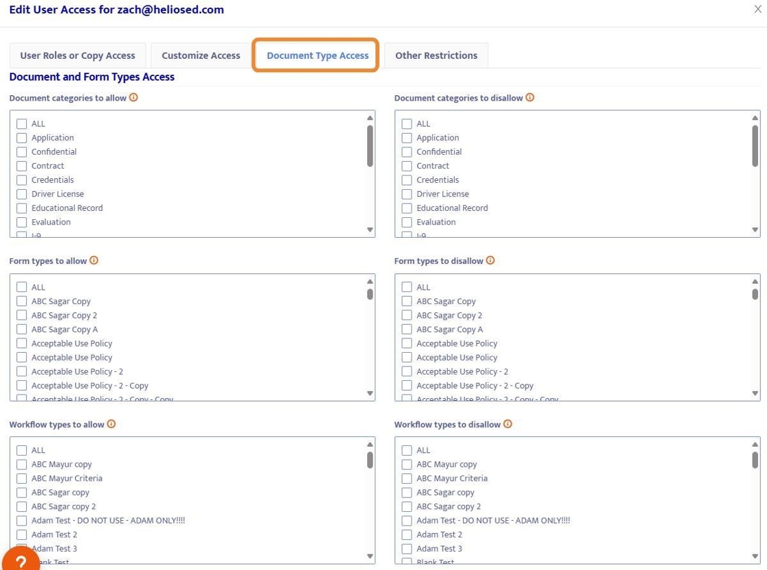 9. In the Document Type Access, you can Allow or Disallow access to different categories.