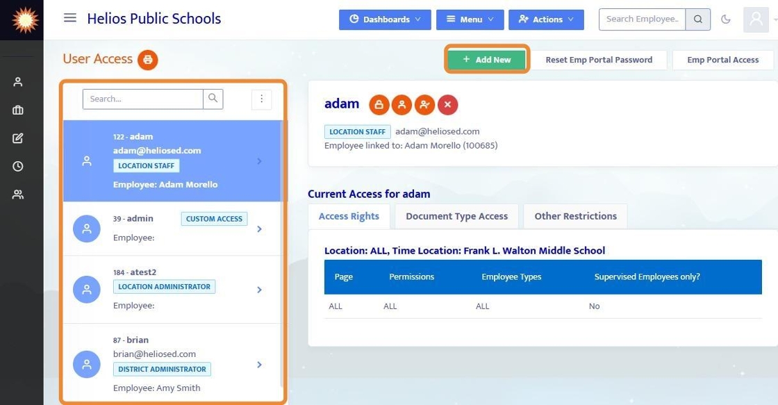 - Location Administrator: Limited to certain location(s)- Read-only access to active employees of the selected locations only. However, user can add, update, or delete records on the Evaluations page. The user cannot view the SSN field on the Profile and Employee Details pages. This role is best suited for principals and deans.