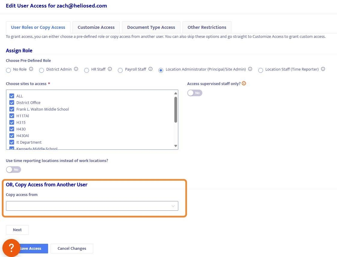 13. Once the User Access has been customized and tested, you can Save Access and then Copy this User Profile to other User's who you'd like to have the same exact access. To do this, open the Edit User Access screen and in the "Copy access from" section, type in the name of the user you'd like to copy access from and then save.