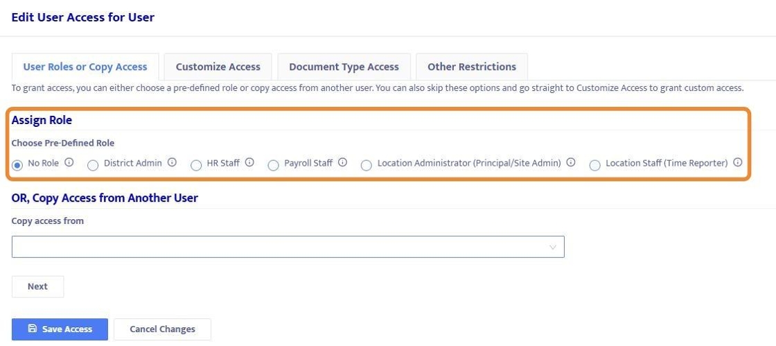 - No Role: Clears all pre-defined roles from the user - but can still be given custom access levels.