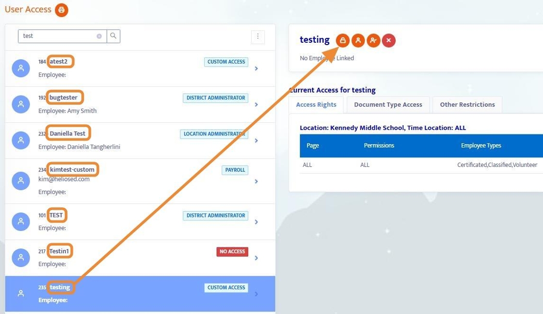 11. Creating a generic Test user to explore different User Access scenarios is a great idea - District Admin can create a generic user, customize access, and then login as that generic user to see if that access meets their needs.