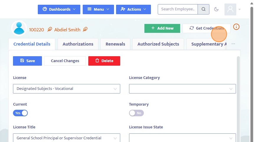 5. The "Get Credentials" button in the employee record works similar to the Get All Credentials but only applies to this one particular employee.
