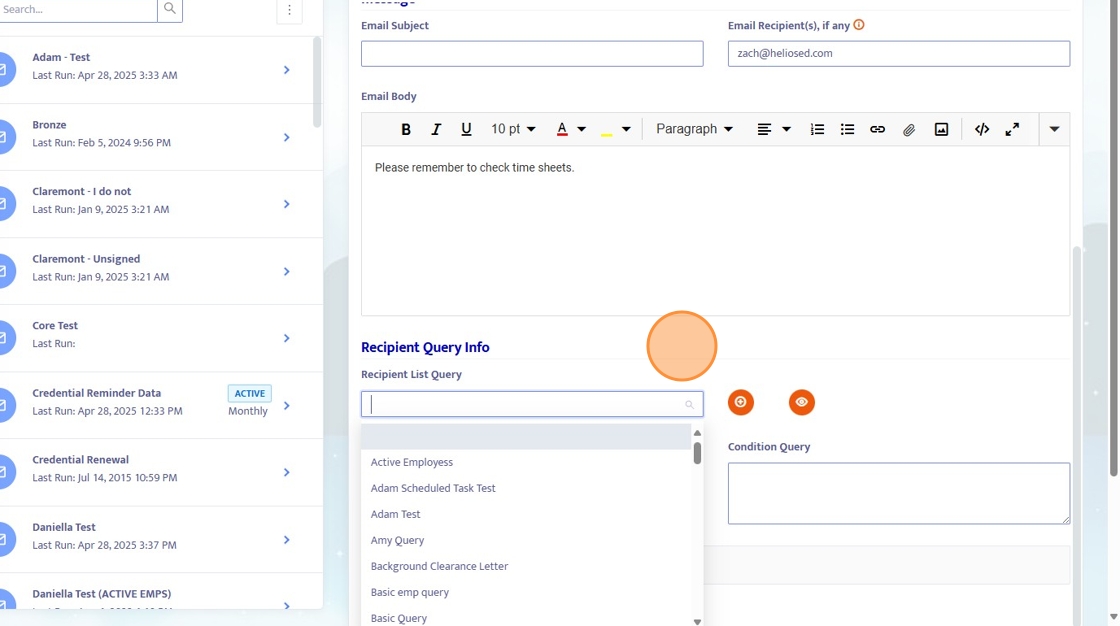 10. If sending to a large list, use the Recipient List Query dropdown - this will show all Queries made and saved in the Report Builder. For more information on building Queries click here