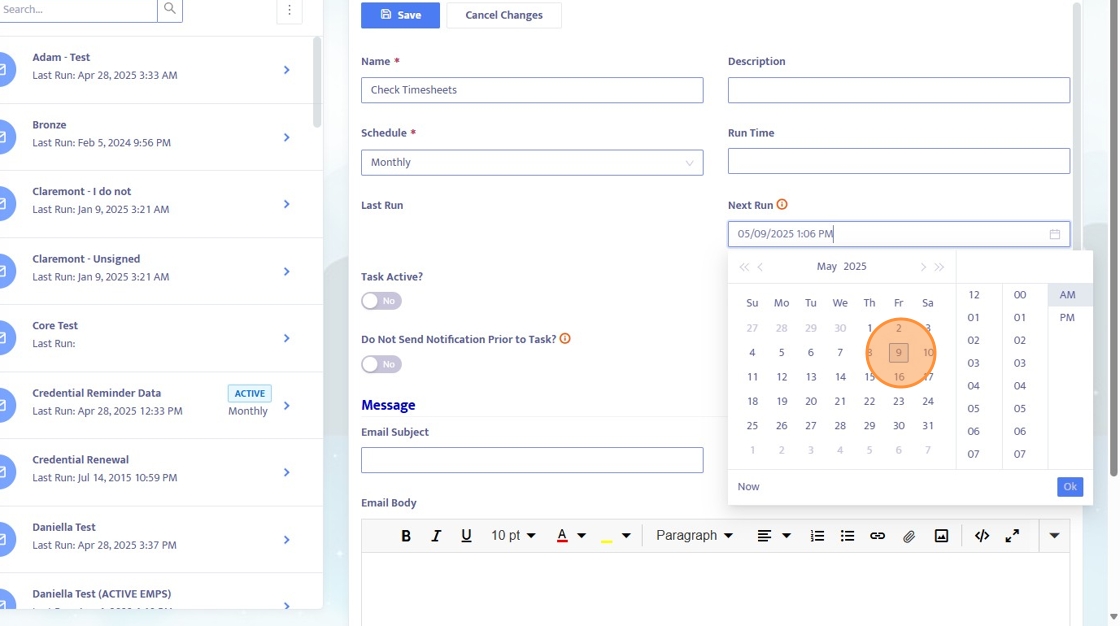 7. In the Next Run field, select the date and time you'd like for this task to run.