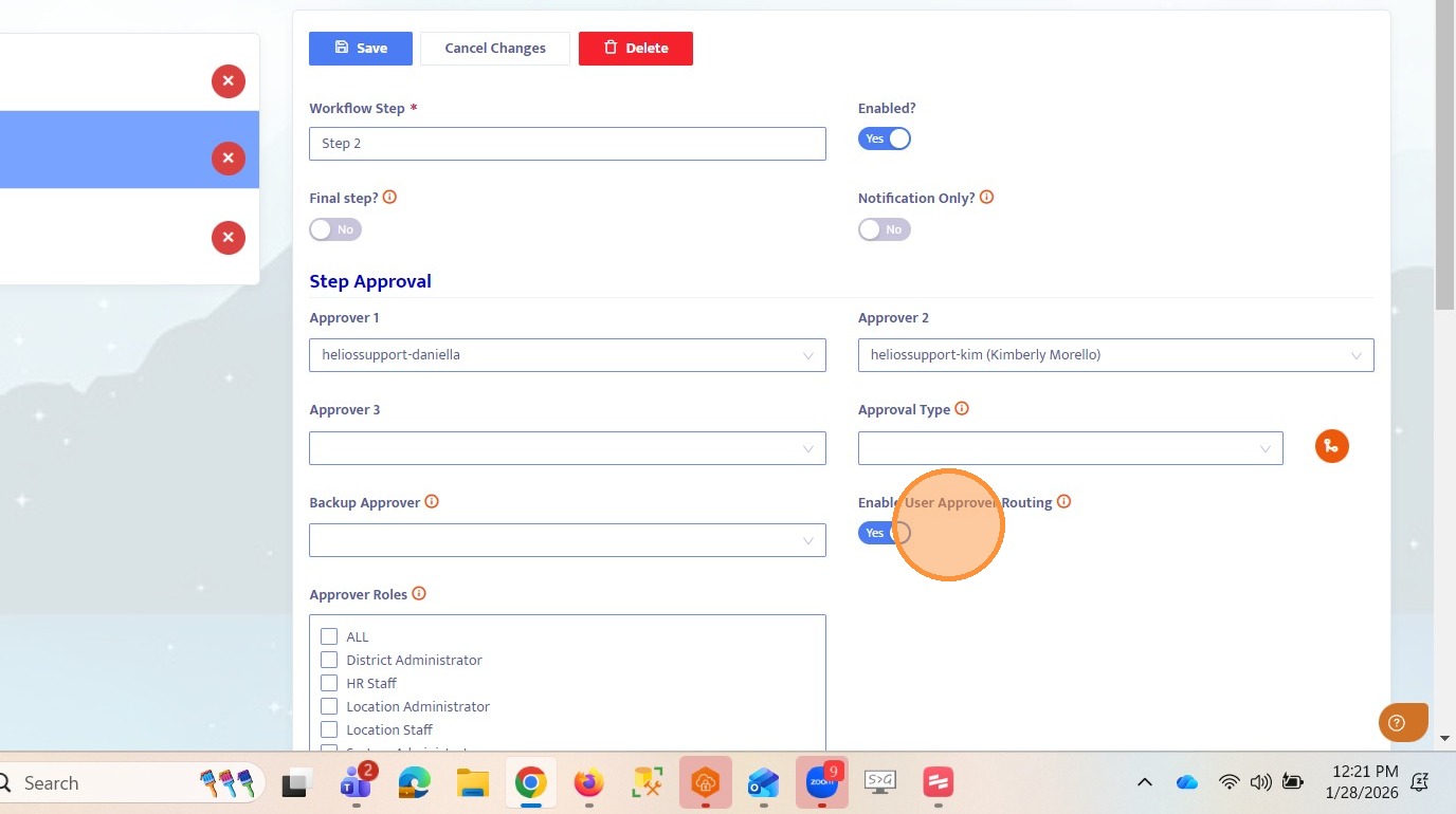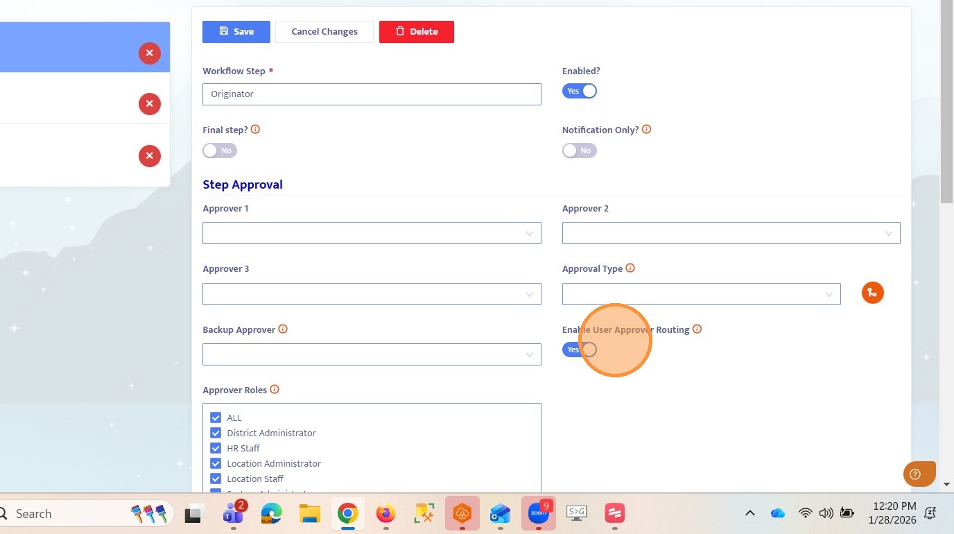 10. Toggle on Enable User Approver Routing for Step 2. This ensures that Step 3 will allow free routing to any user in the system.