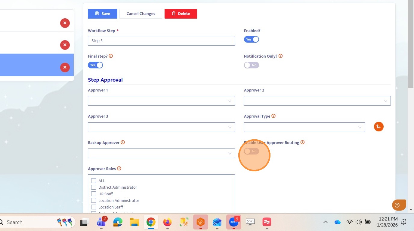 13. The Enable User Approver Routing toggle is not enabled for Step 3 because this is the final step of the workflow. User approver routing cannot be enabled on the final step since there is no subsequent step for it to apply to.