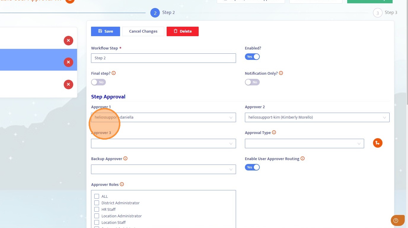 9. In Step 2, you will see predefined approvers listed, along with the Enable User Approver Routing toggle. The listed approvers define who the workflow can be routed to at this step. Because user approver routing was enabled in the previous step, the workflow can also be free routed to any other user in the system.