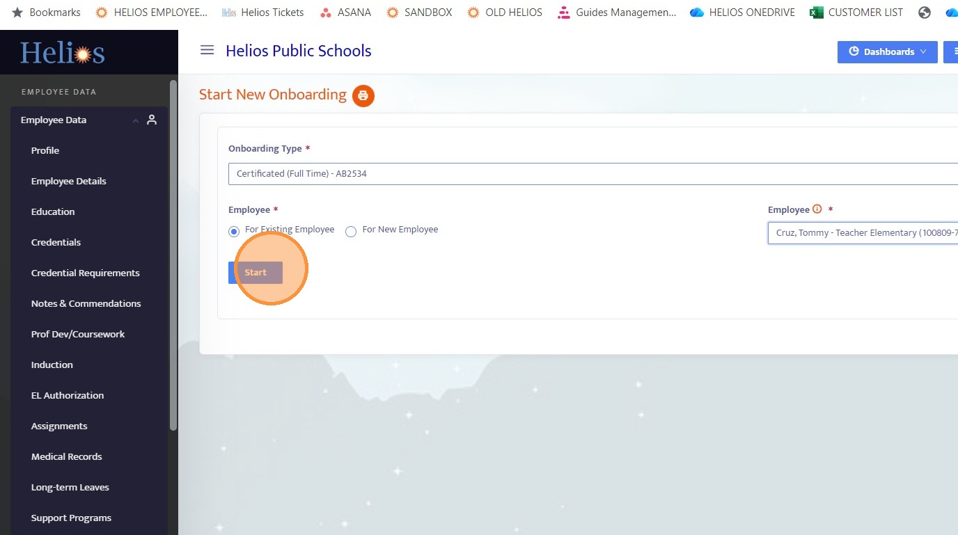 14. Select the onboarding type that includes the external form, choose an existing employee, and click Start.