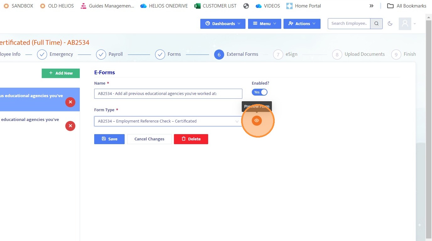 8. Click the eye icon to preview the selected external form.