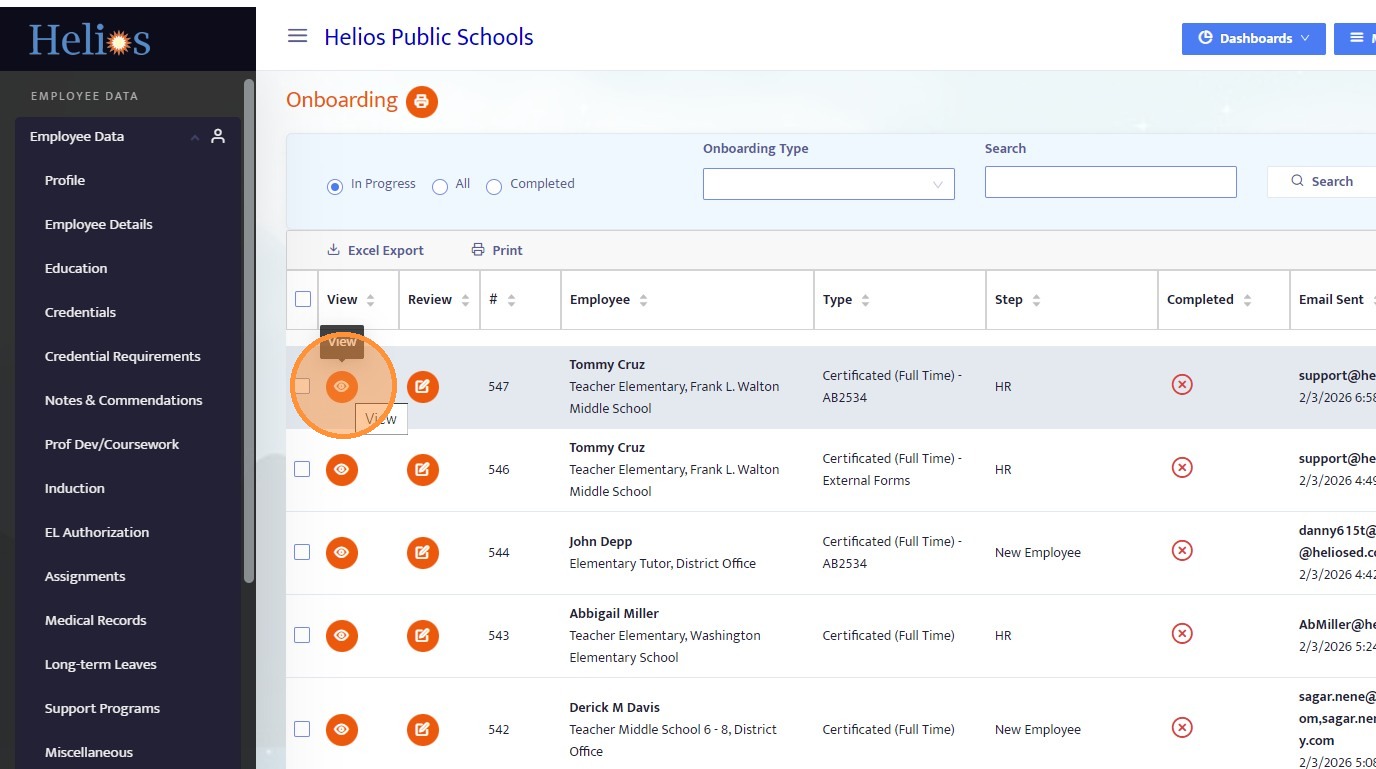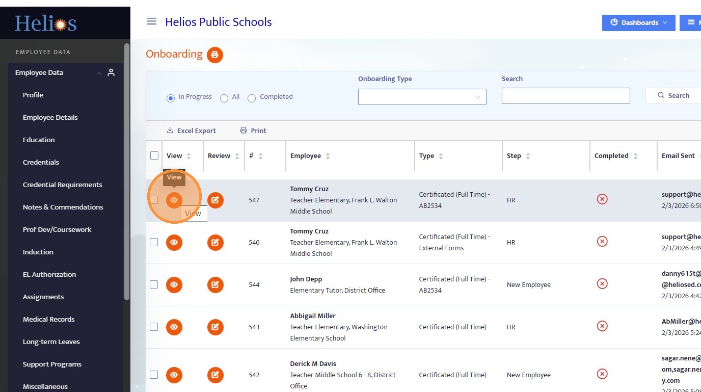 23. Locate the employee’s onboarding record and click View.
