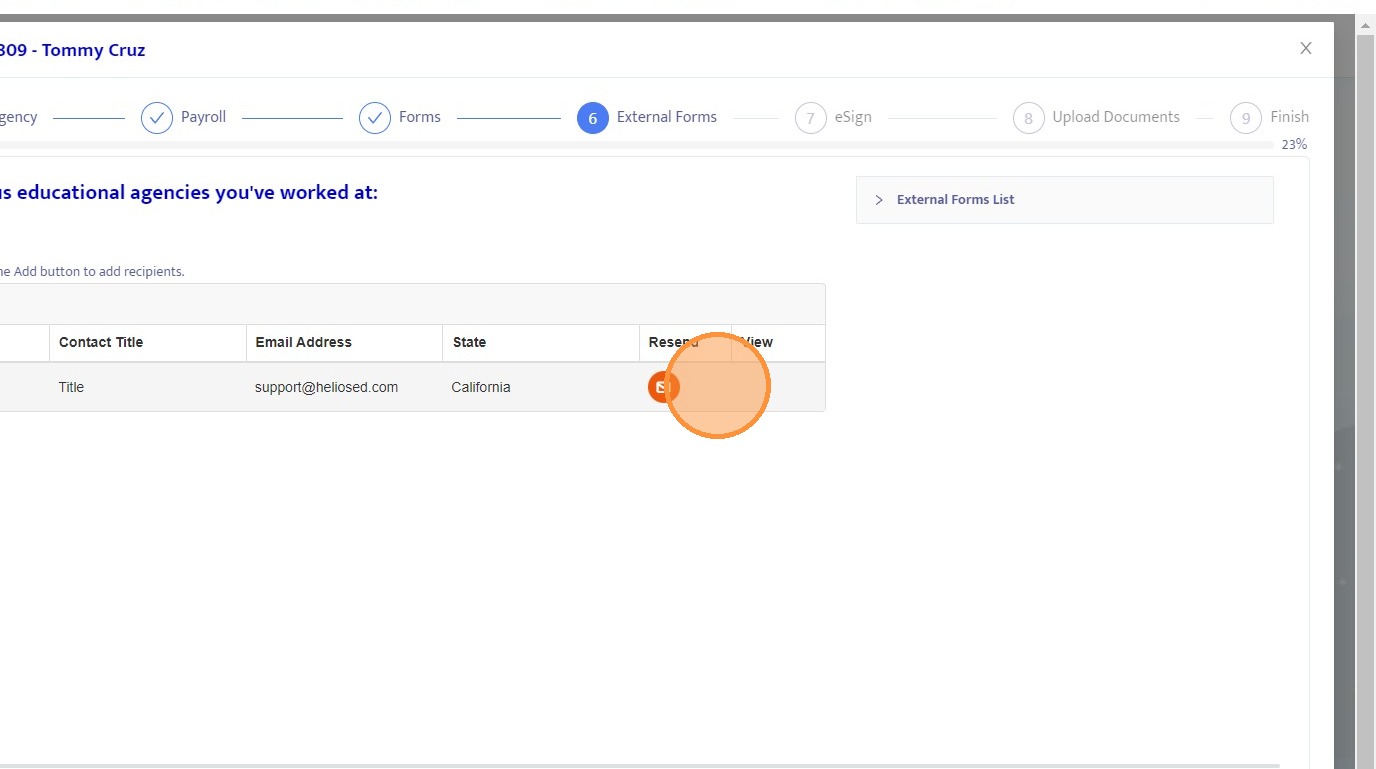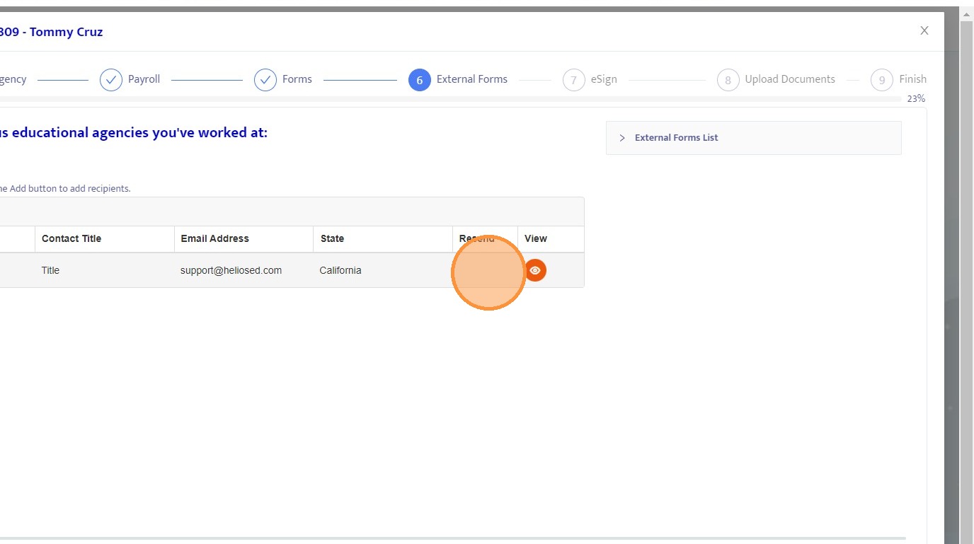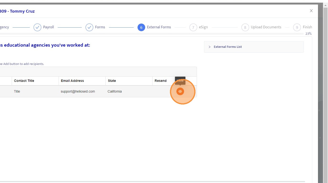 25. From this screen, you can resend the external form if needed, such as when correcting an email address. Once the form is submitted, a View button will appear, allowing you to review the completed form.