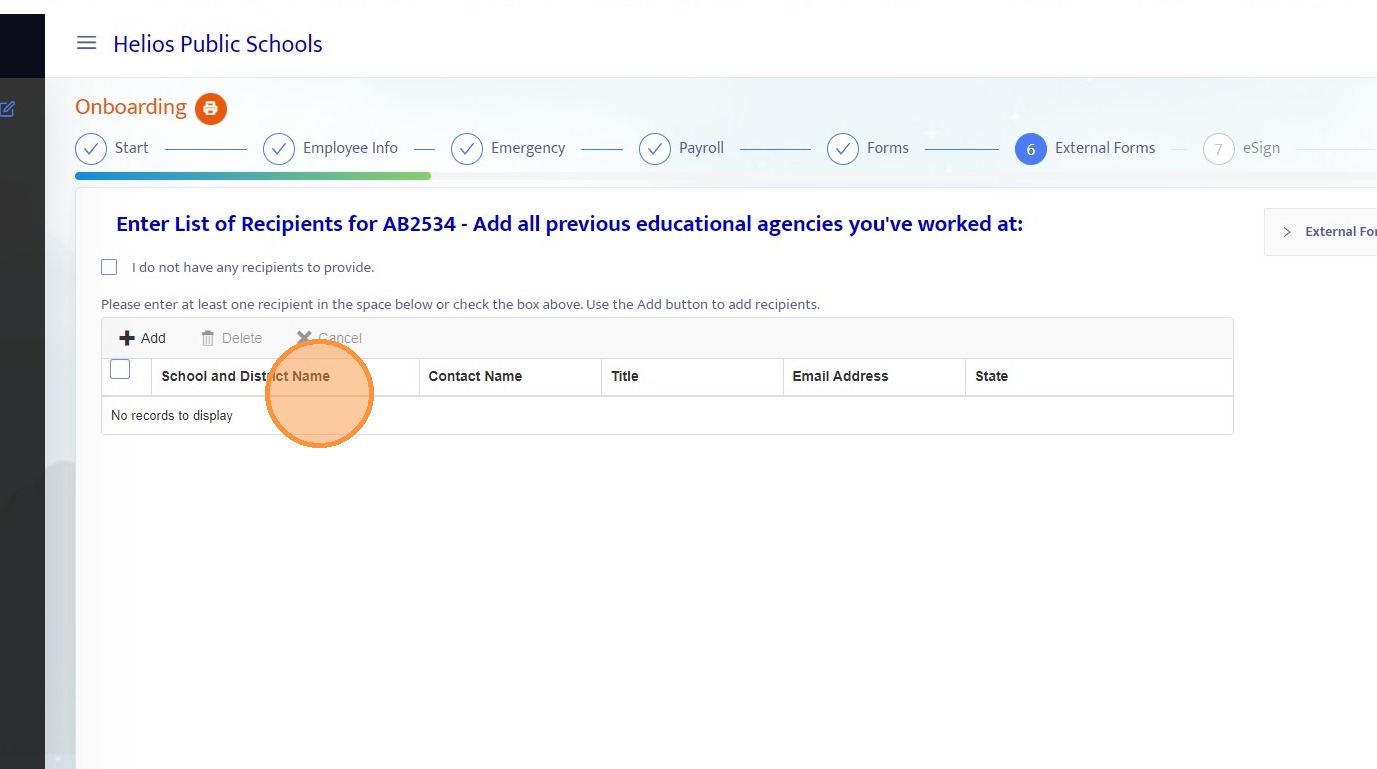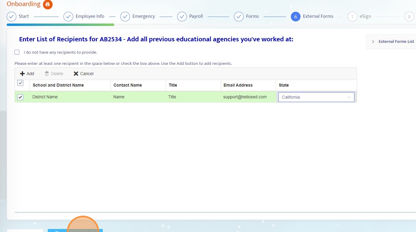 12. You will see that the onboarding employee can enter recipient information for the external form at this step.